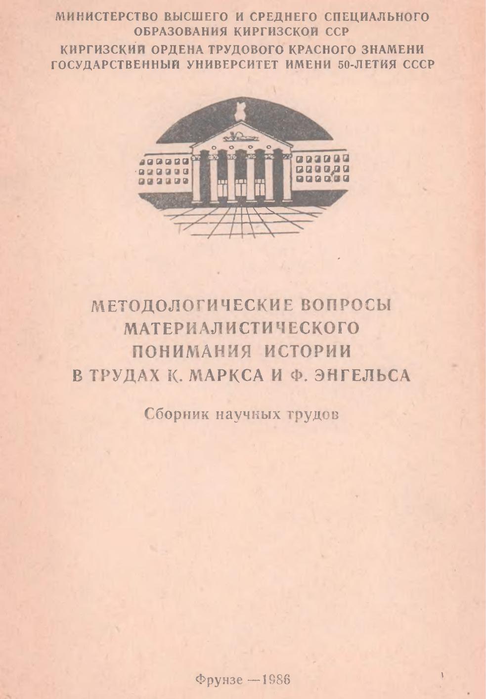 Министерство высшего и среднего специального образования Киргизской ССР. Киргизский ордена трудового красного знамени Государственный университет имени 50-летия СССР. Сборник научных трудов. Фрунзе. 1986.
